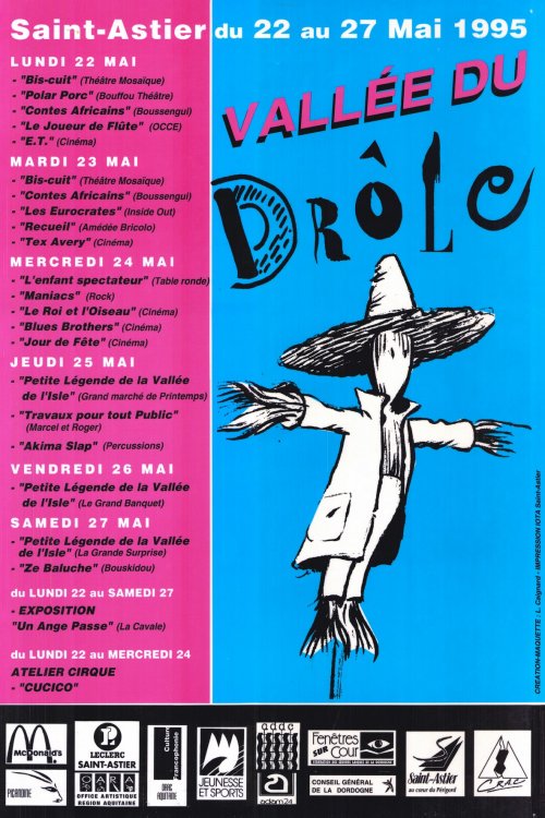 Drole. Un mot qui renvoie à l’humour et aux enfants. Le drole c’est le gamin en occitan. Tel sera le thème d’un festival qui aura lieu la semaine de l’Ascension, à Saint-Astier. L’an dernier déjà s’y était déroulée la Vallée du Rock. On y retrouvera ce même esprit de fête et de convivialité, comme l’ont souligné Jacques Monmarson, maire de Saint-Astier et Bernard Criner, secrétaire général de la FOL 24. "Ce sera une rencontre entre différentes formes artistiques, tournée en priorité vers un public populaire dans une perspective d’ouverture à tous." Chantal Gibert [Sud Ouest] Cette année-là, La Vallée reçoit : Maniacs, Bloody Beatnix, Théâtre Mosaïque, Bouffou Théâtre, Rémy Boussengui, Théâtre, la Cavale, Cu-Ci-Co, Amédée Bricolo, Inside Out Théâtre, Company, Akima Slap, Théâtre, des Taffurs, Marcel et Roger, Bouskidou. Drole d’adaptation que cette Petite légende de la Vallée de l’Isle. Le conte du Joueur de flûte de Hamelin va être prétexte à une drolerie façon astérienne : plus de cent personnes qui, avec le théâtre des Tafurs, nous embarquent, nous transportent ailleurs, plus loin... au pays de l’enfant Roi. Selon le scénario imaginé par François Mauget et Jean-Philippe Ibos, les héros sont remplacés par des explorateurs tombés du ciel et les rats par des épouvantails. Les premiers apparaissent sur le balcon de la mairie, dans des boutiques et sur les fours à chaux ! Qui sont ces « paillus » et ces « foins-foins » qui peu à peu envahissent la cité ? Ce n’est pas du goût de la Mère Astier qui règne sans partage sur la localité. L’histoire s’enracine dans la vie locale, d’abord sur le marché puis a l’occasion du banquet du vendredi soir et le samedi lors d’une gigantesque fête où la ville est entièrement livrée aux enfants. Une farce bouffonne à trois semaines des élections municipales, qui permit de réfléchir tout en riant sur les rapports passionnés entre les élus et leurs électeurs.